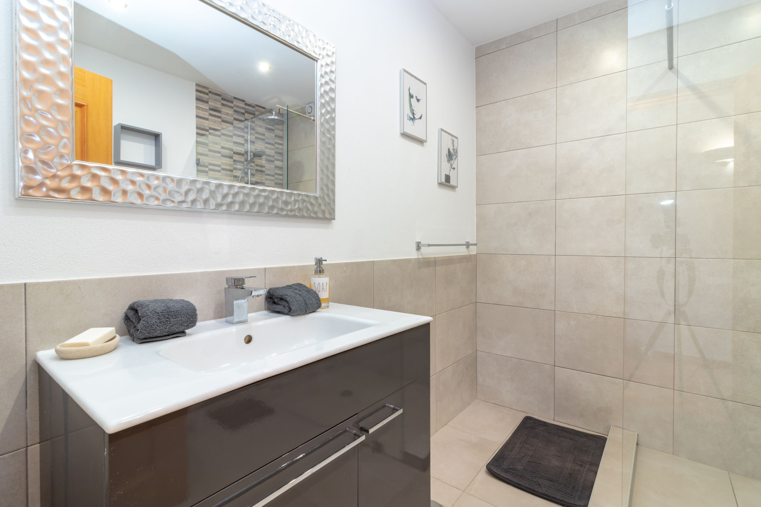 Stairs from the entrance level lead down to a lower level with two en-suite bedrooms. Both rooms have double beds, and the bed in the second bedrooms can be split into 2 single beds. Sliding doors from the second bedroom lead to a terrace equipped with sun loungers.