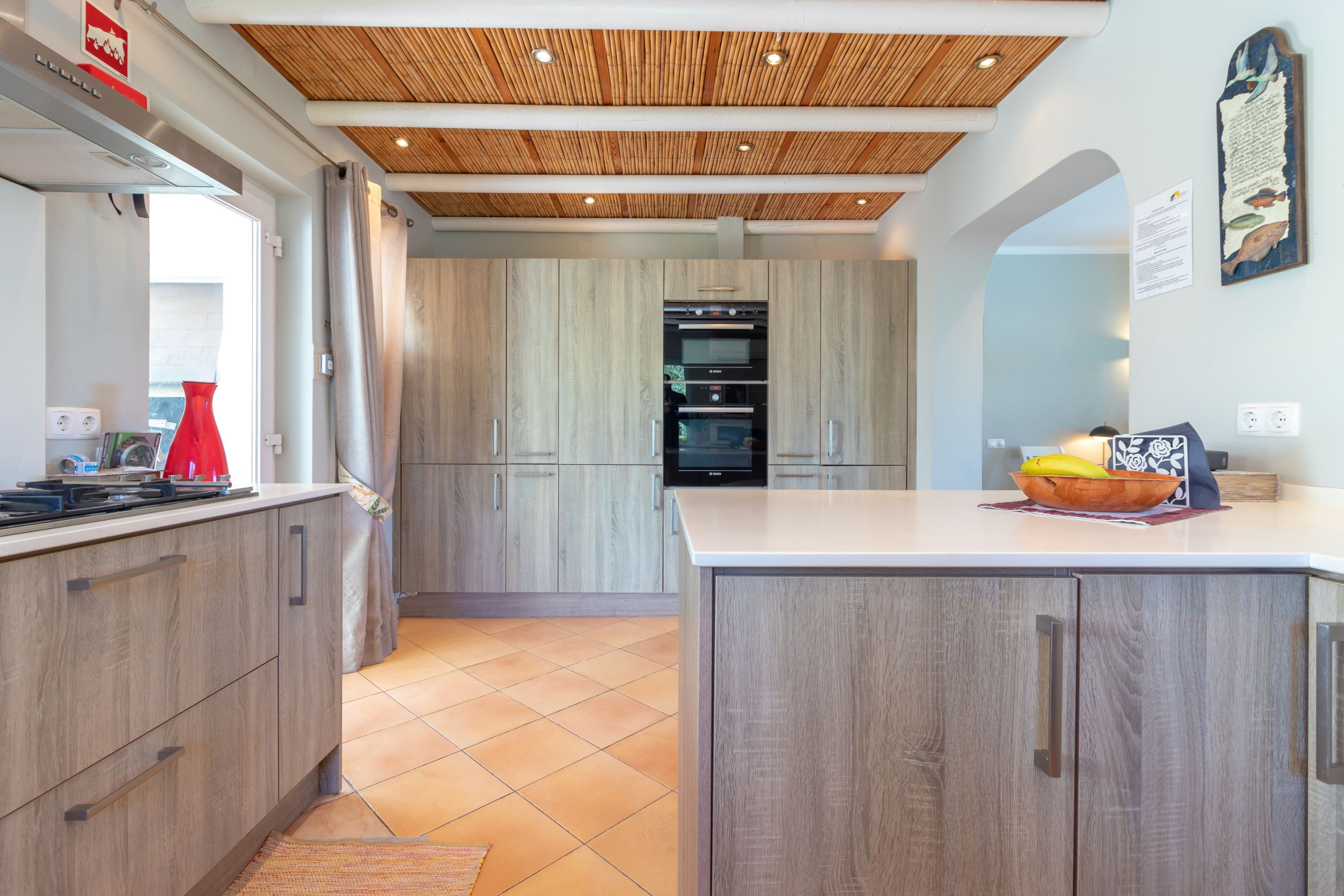 On entering the villa there is a ‘home from home’ fully equipped kitchen, with a washing machine available next to the kitchen in its own utility area. The kitchen opens up onto a very spacious living area with sofa, chairs, log fire and dining area for 8 people. The property is particularly great for two families holidaying together, offering two separate wings of sleeping accommodation. Wing one has two twin rooms (one en-suite) and a further bathroom. Wing two also has two twin rooms, serviced by a shared bathroom. All the bedrooms benefit from air conditioning. Fibre optic Wifi is available and the TV offers offer a selection of English and multinational channels. There is also an iPad docking station, DVD player, English and German books and a selection of cards and games. A cot and highchair are available to rent on request. Beach / pool towels are provided.